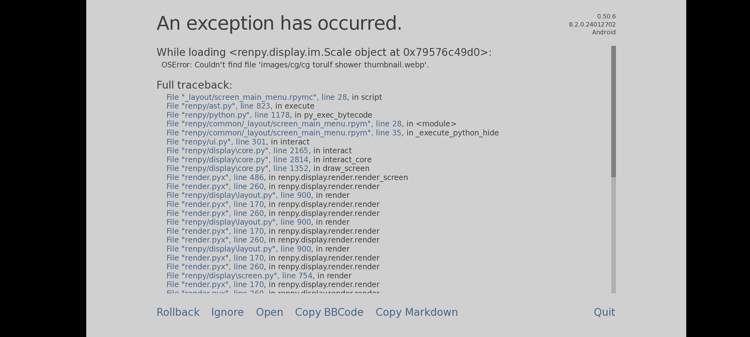 yup, if you look at the files you'll see that the torulf shower thumbnail was placed into the nsfw cg folder, but the calls for it were not changed, so it is trying to pull a file that doesnt exist (in that location) anymore. happens on all devices to my knowledge, you could in theory mess with the code yourself but that would be very complex so for now you can just extract the archive.rpa with a tool like rpaextract, or just simply go back to an older version to see the cgs on that page.