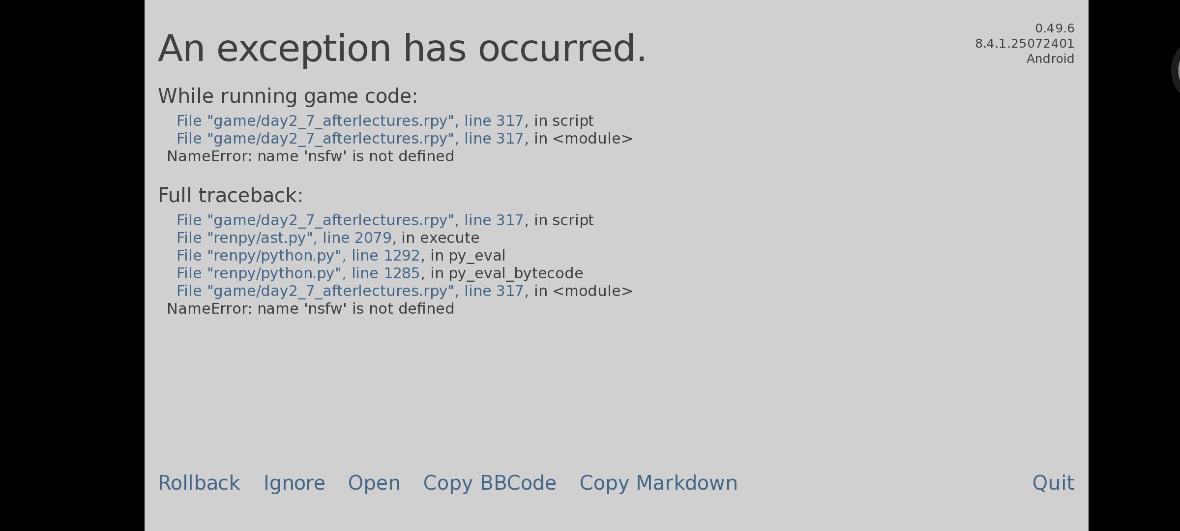We've downgraded from RenPy v8.4 to v8.2 because of issues on Android; saves made very recently might not work for that reason, we're sorry about that :c